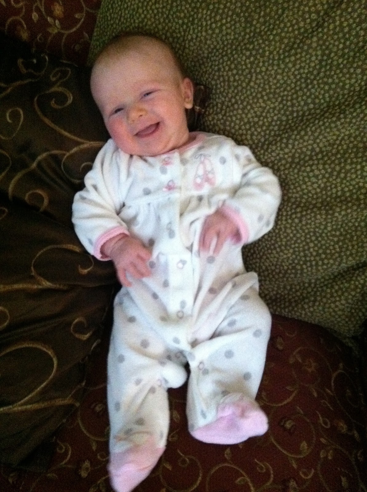 This week has been one of great milestones for RLT! She rallied and finally took the bottle in preparation for daycare, took a nine hour road trip to visit some friends with mommy, found her hands, and slept through the night!!!
